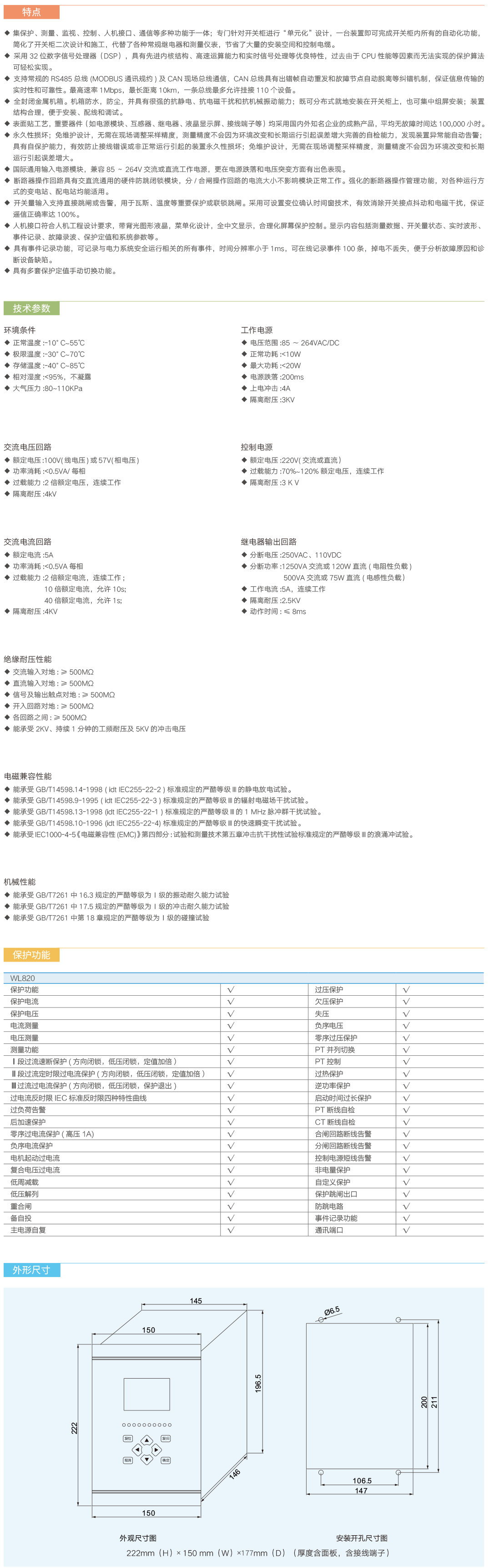 WL820数字式微机保护装置是保护、监视、控制、通信等多种功能于一体的电力自动化高新技术产品,是构成智能化开关柜的理想电气单元。多种功能的高度集成,灵活的配置,友好的人机界面,使得WL820通用性微机保护测控装置可作为35KV及以下电压等级的不接地系统、小电阻接地系统、消弧线圈接地系统、直接接地系统的各类电气设备和线路的保护及测控,也可作为部分66KV、110KV电压等级中系统的电压电流的保护及测控。
