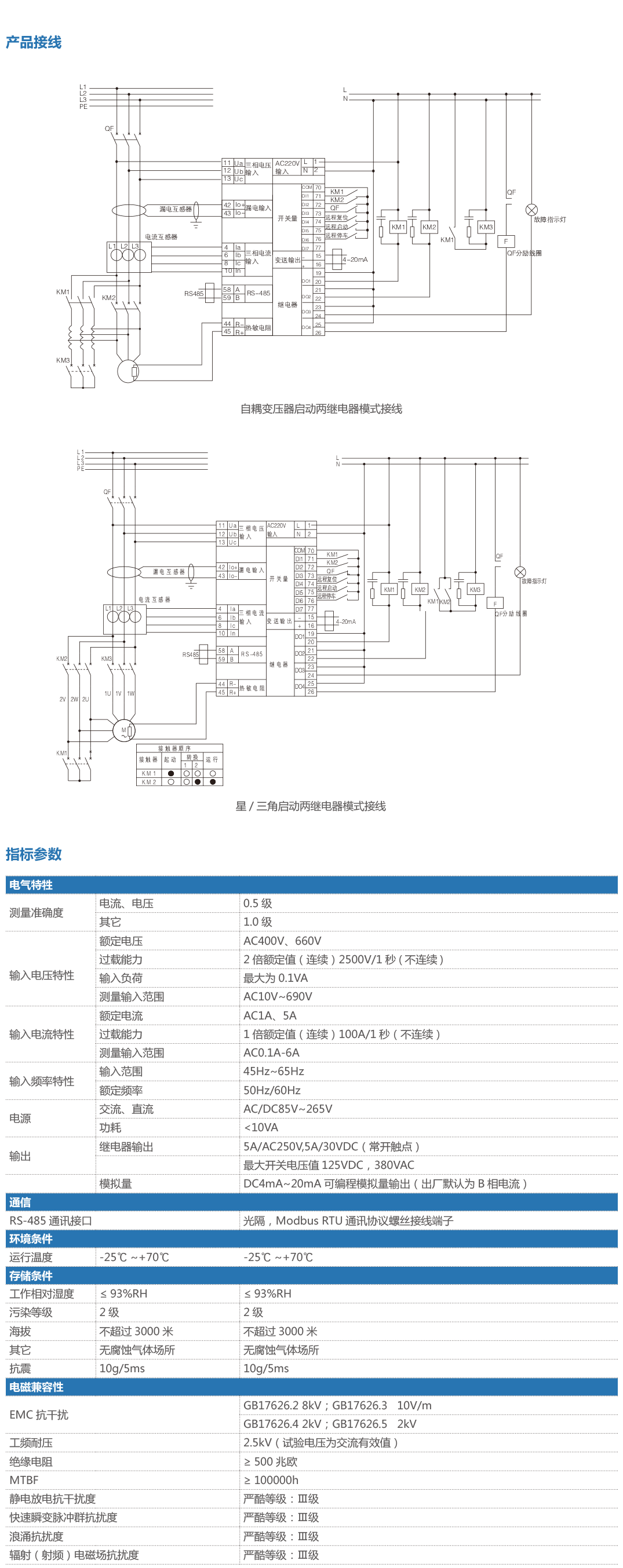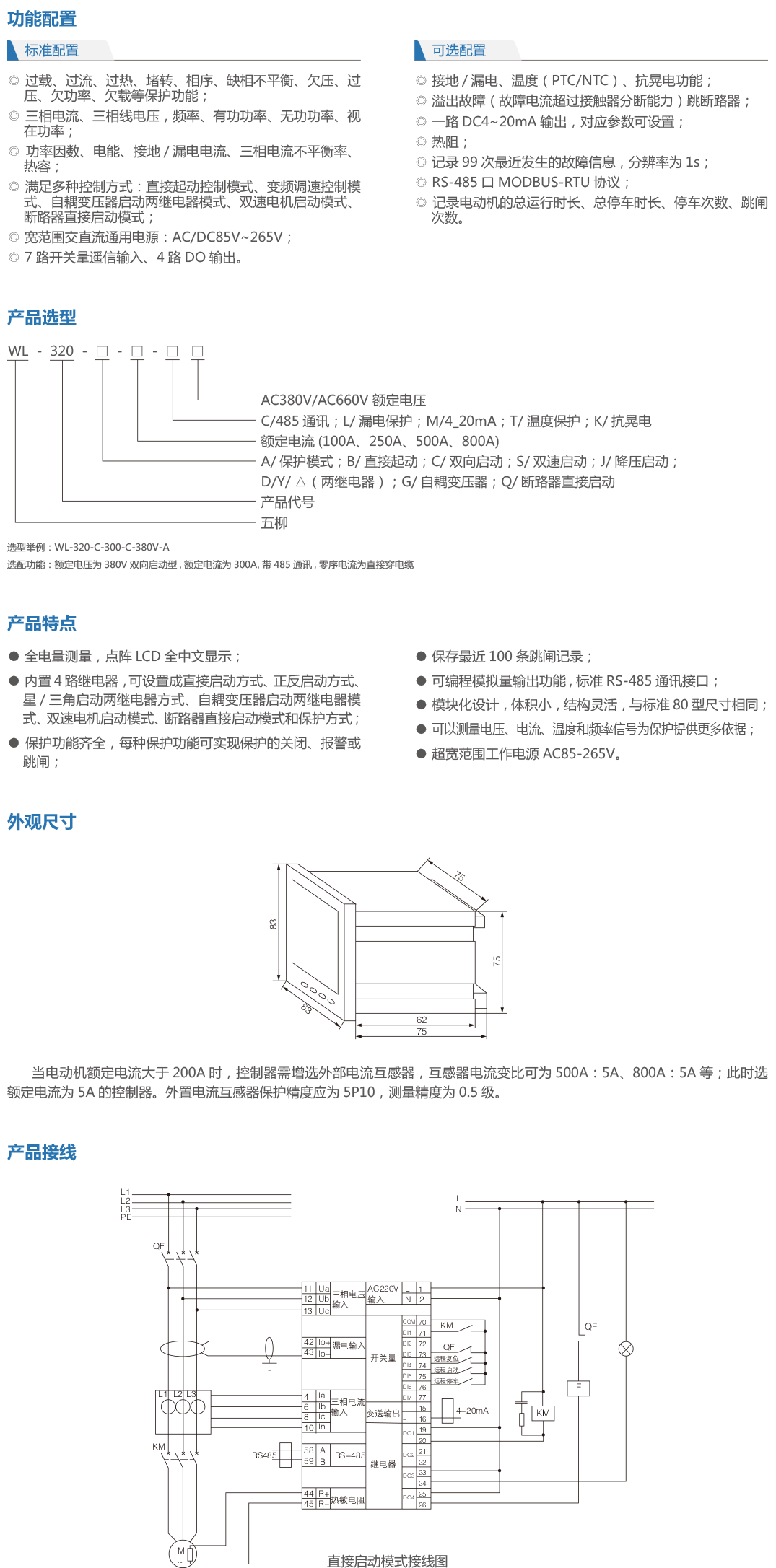 WL-320可采集并计算三相电流,三相线电压,频率、有功功率、无功功率、视在功率、功率因数、电能、接地电流等数据,将这些数据计算后和保护器记录的各种保护功能整定信息进行比较,当符合保护动作条件时,驱动继电器输出,从而达到可靠保护电动机的目的。