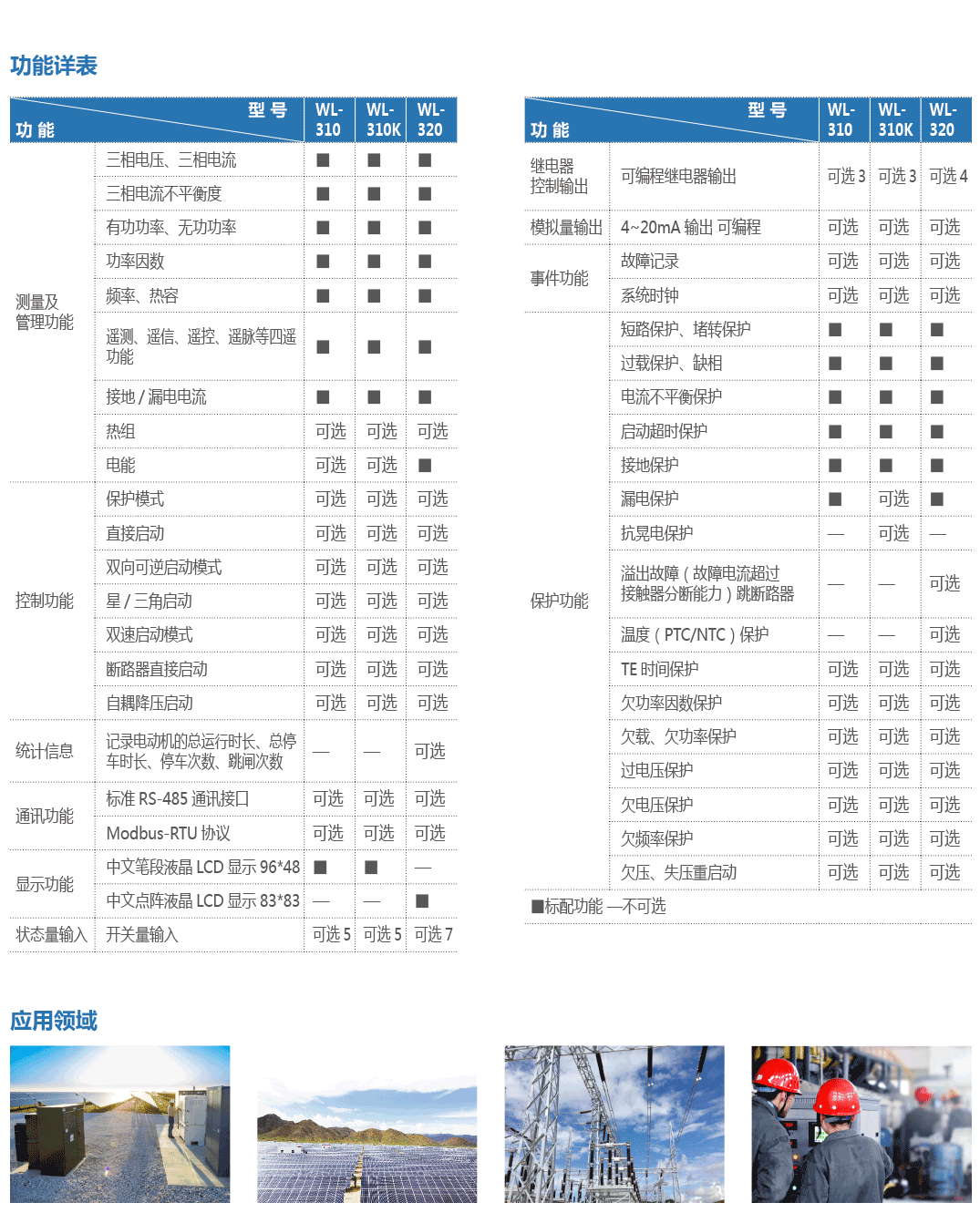 WL-320电动机保护器适用于额定电压690V以下,额定电流至800A的低压电动机保护和监控。该系列产品通过对现场信号实时监测,并对电机的启动不正常、过载、过流、过热、堵转、相序、缺相不平衡、欠压、过压、欠功率、欠载、接地或漏电等故障引起对电动机的危害给予以系统保护,可实现多种操作控制功能,同时具有测量、自我诊断、维护管理、现场总线通讯等功能。